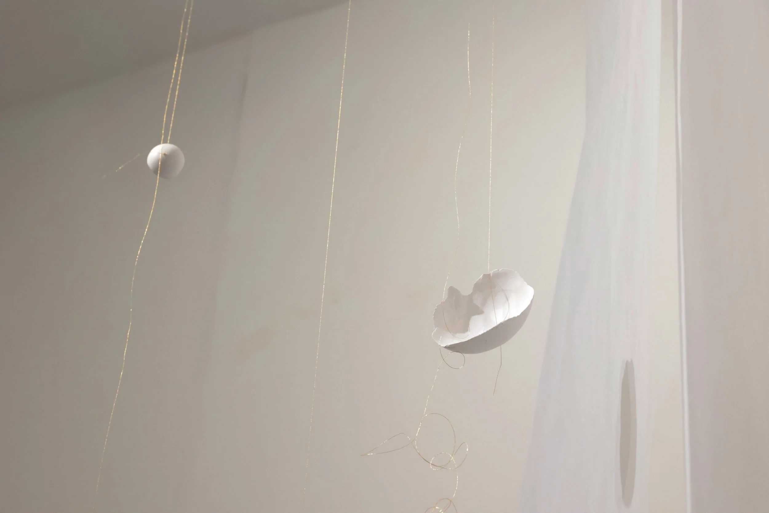 (Porcelain, white cotton, metal pearl pins, black cotton and mesh nets) Size L 280 x H 170 x D 150cm