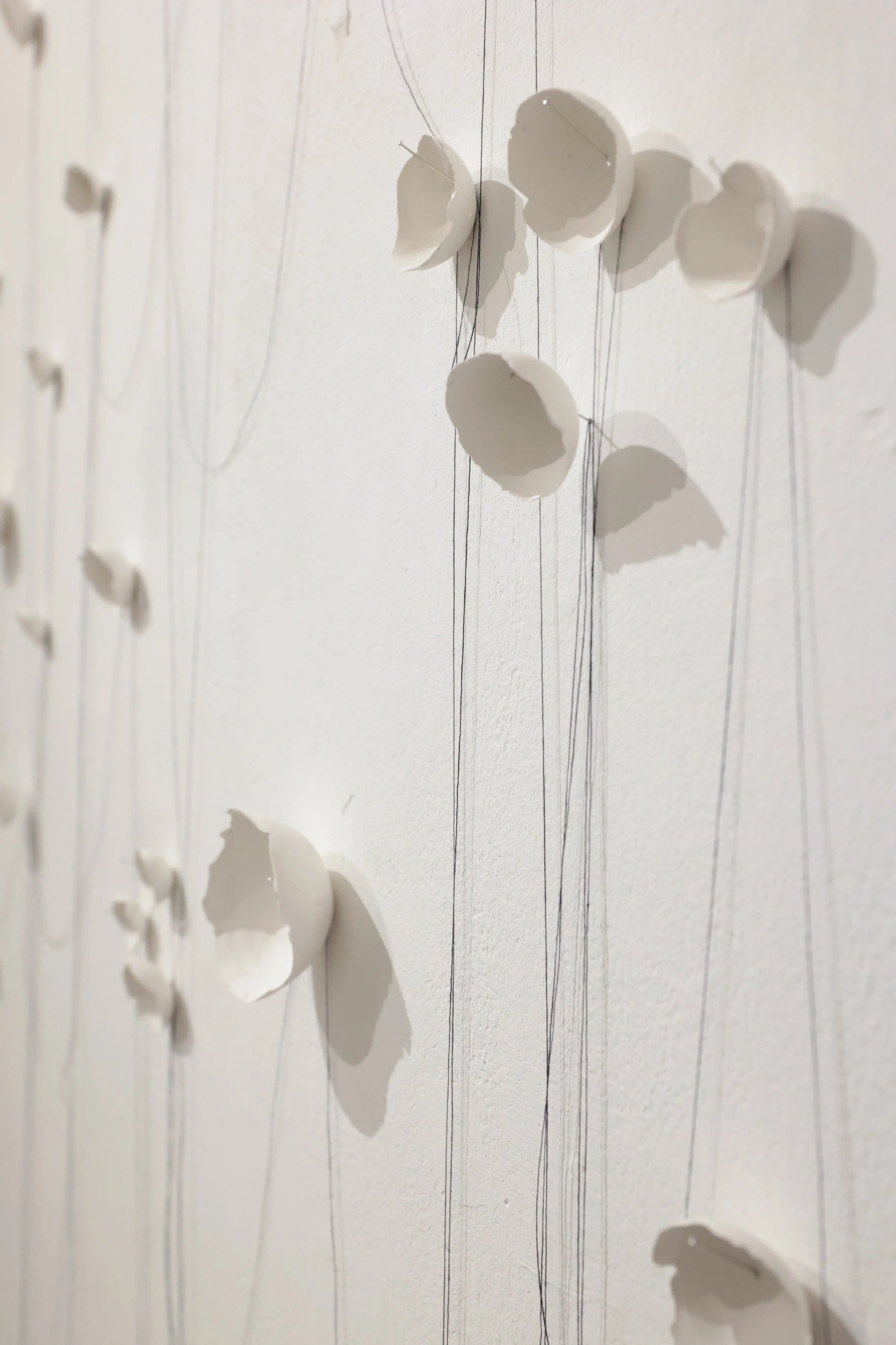 (Porcelain, black cotton and sewing pins.) Size L 240cm x H 220cm